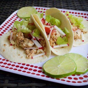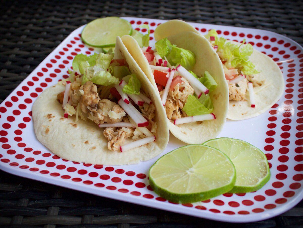 - Spoon 1/3 cup of the chicken mixture onto 6” tortilla. Top with lettuce, cheese, tomatoes and radishes or toppings of your choice. Serve immediately.