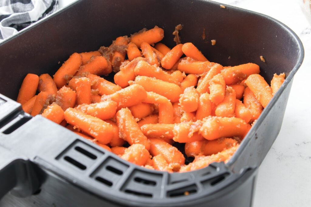 - Add in the carrots and air fry at 330 degress for 8-11 minutes, until carrots are tender.