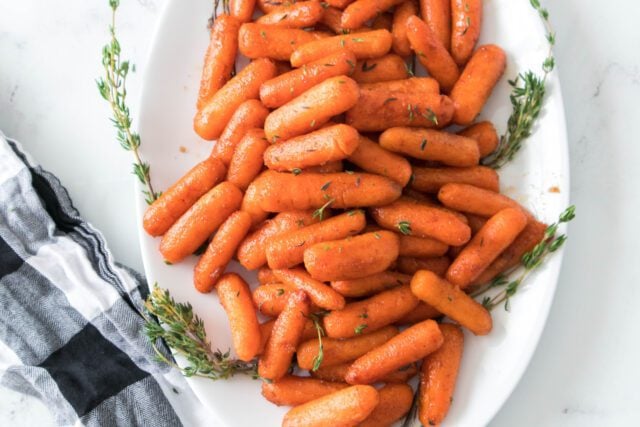 - Plate the cinnamon sugar carrots and sprinkle with fresh thyme if you are using.