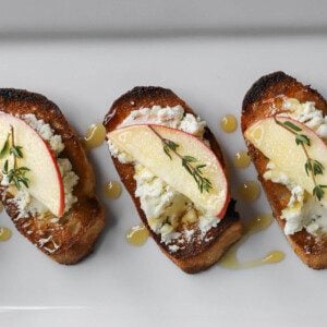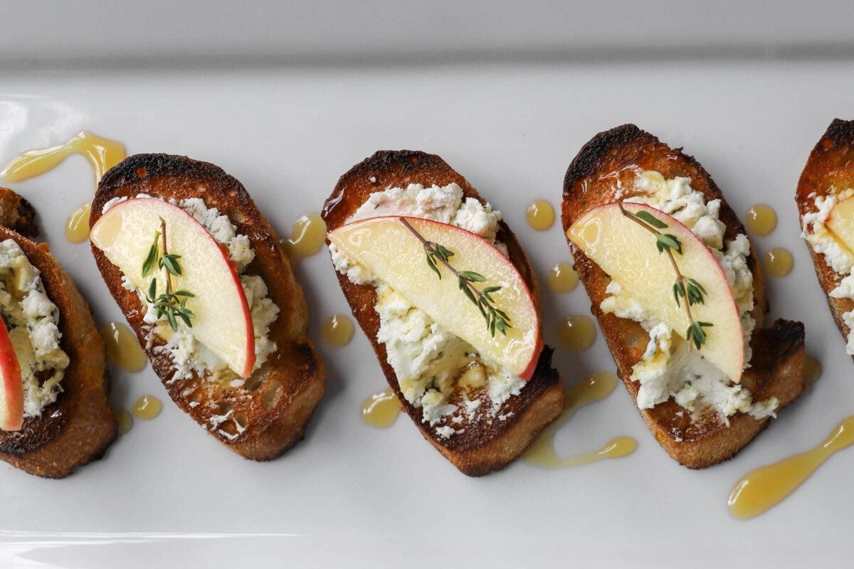 - Spread the goat cheese mixture onto baguette slices. Top with apple slices and drizzle with honey. Garnish with a sprig of thyme and plate.