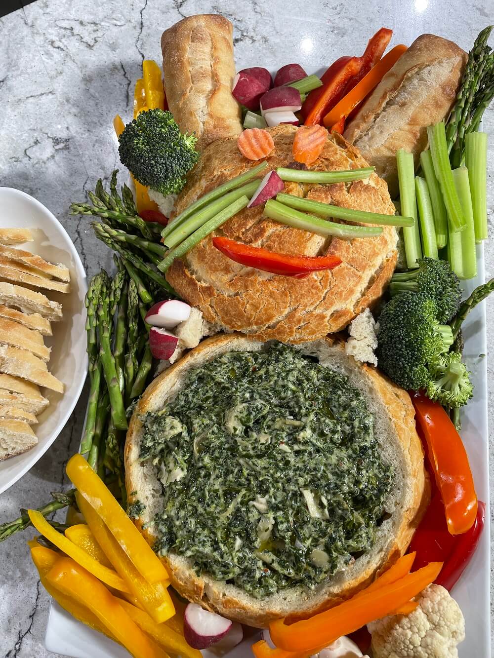 To make the bowl itself, start with round loaf of bread, like Hawaiian or sourdough. Slice off the top in a “lid” shape and cut out some (but not all) of the fluffy middle of the bread to make a bowl. Leave about an inch between the bowl and the crust. Now fill the bowl with the spinach artichoke dip. This dip is great while warm, but is just as delicious at room temperature! Give it a bunny shape by arranging the baguette and bread pieces on the tray around the bread bowl, then fill up the rest of the try with all the veggies your family loves. We used cauliflower, pepper slices, asparagus tips, and celery to give our guests lots of options for dipping.