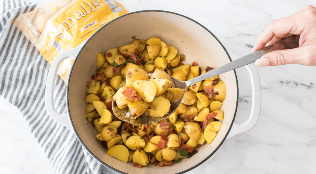 overhead shot of german potato salad in white dutch oven topped with crisp bacon and parsley with bag of wada farms smalls gold potatoes
