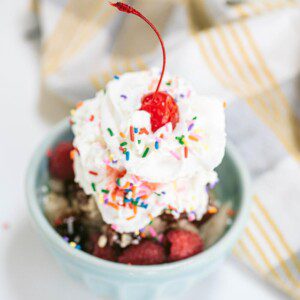 While we love both ice cream and nice cream on their own (who doesn’t?!), a sundae is all about the toppings! Ours features fruity Triple Berry Jam and tart raspberries. Crunchy Rice Krispies and colorful sprinkles add some fun to these toppings. We capped it all off with a classic whip cream swirl and a cherry on top!