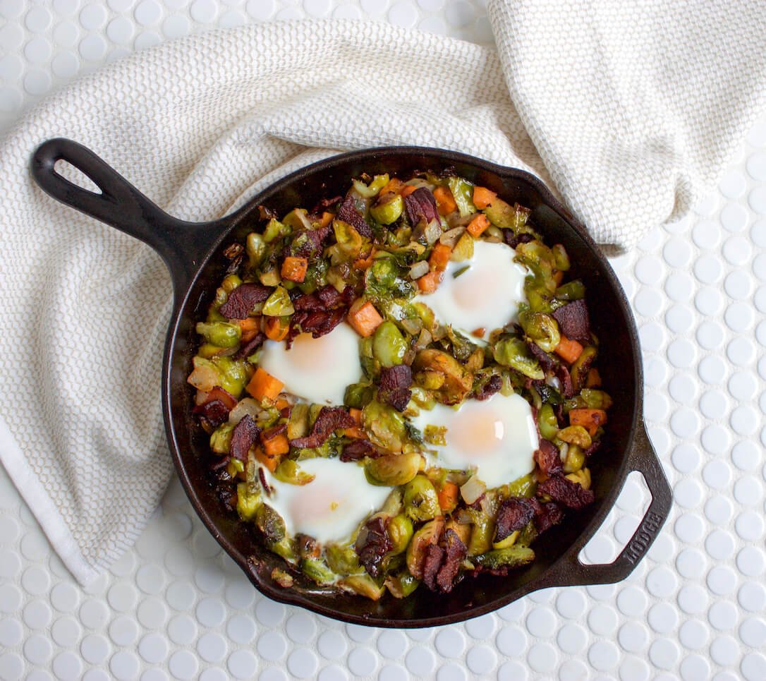 In this recipe, bacon, eggs, Brussels sprouts, and sweet potatoes come together in a cast iron skillet to create a savory symphony of flavors! This dish does require a bit of time to put together, about 50 minutes including cook time, but the end result is worth it. It’s a great recipe to have on hand for weekend or holiday breakfasts. Plus, you’ll save time on clean-up because this recipe only uses one skillet!