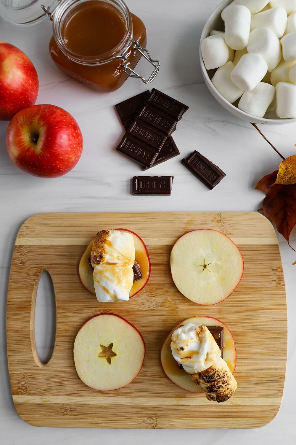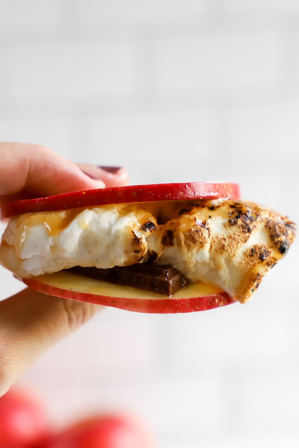 - Place toasted marshmallows on top of the chocolate. Drizzle with caramel sauce and a sprinkle of sea salt. Top with another apple slice.
