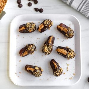 - Stuff each date with peanut butter (about a teaspoon each).