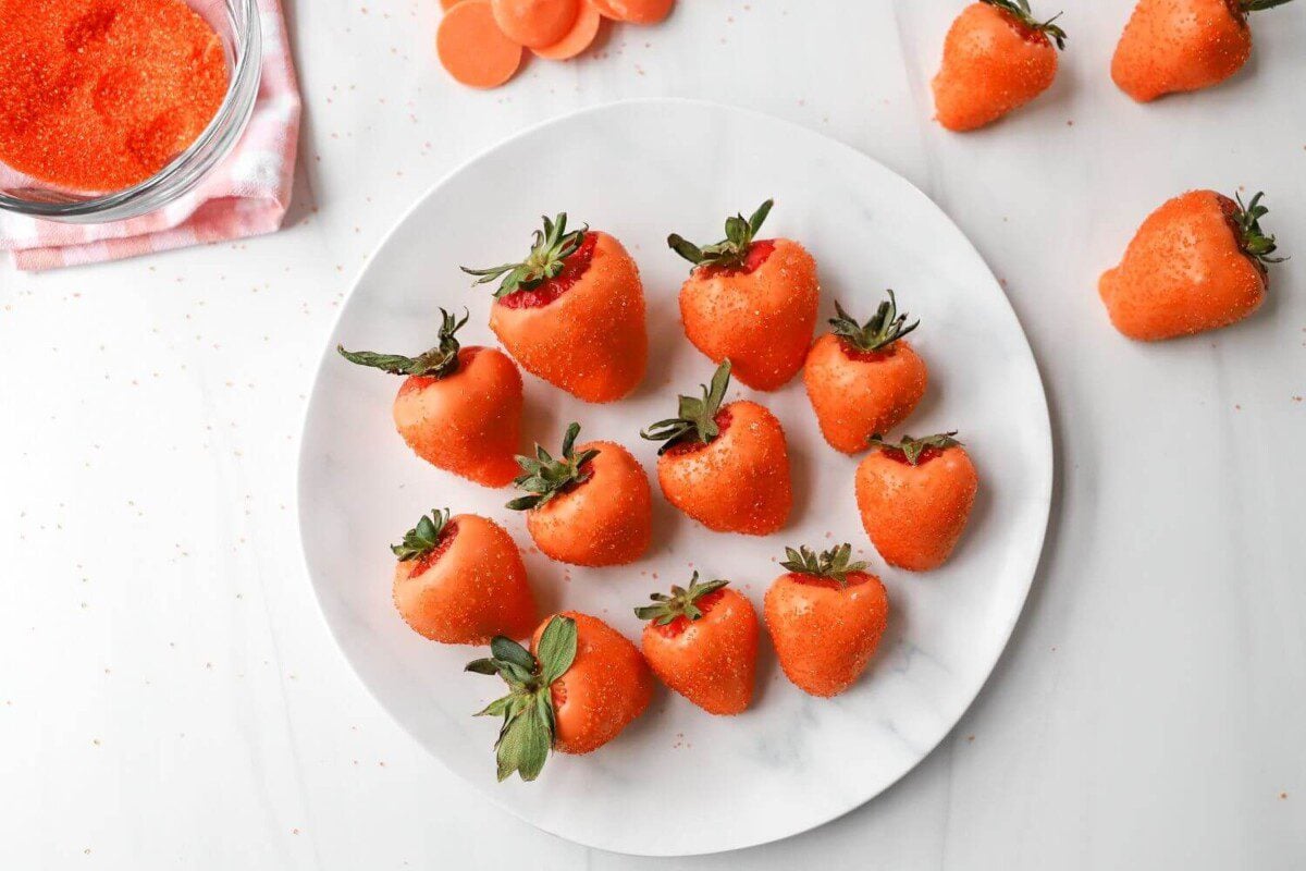 We love using melting chocolate to make creative desserts and snacks. Chocolate-covered fruit is a well-loved treat, but these Chocolate-Dipped Strawberry Carrots turn it into something more! Whether you’re entertaining friends or family this holiday, your guests are sure to be dazzled by these sprinkled snacks.
