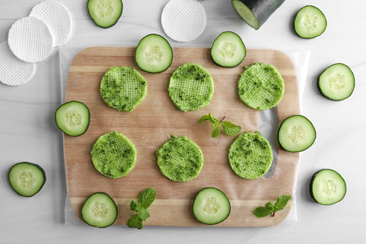 These DIY cucumber eye pads only take a few minutes to make. Simply blend together a cucumber with fresh mint and aloe vera gel. Then, dip cotton rounds into the mixture and freeze until solid, or about two hours. To make the cucumber easier to blend, roughly chop it up before placing it into the blender. Once the eye pads are frozen solid, you can transfer them into a freezer bag and store them in the freezer until they are ready to use.