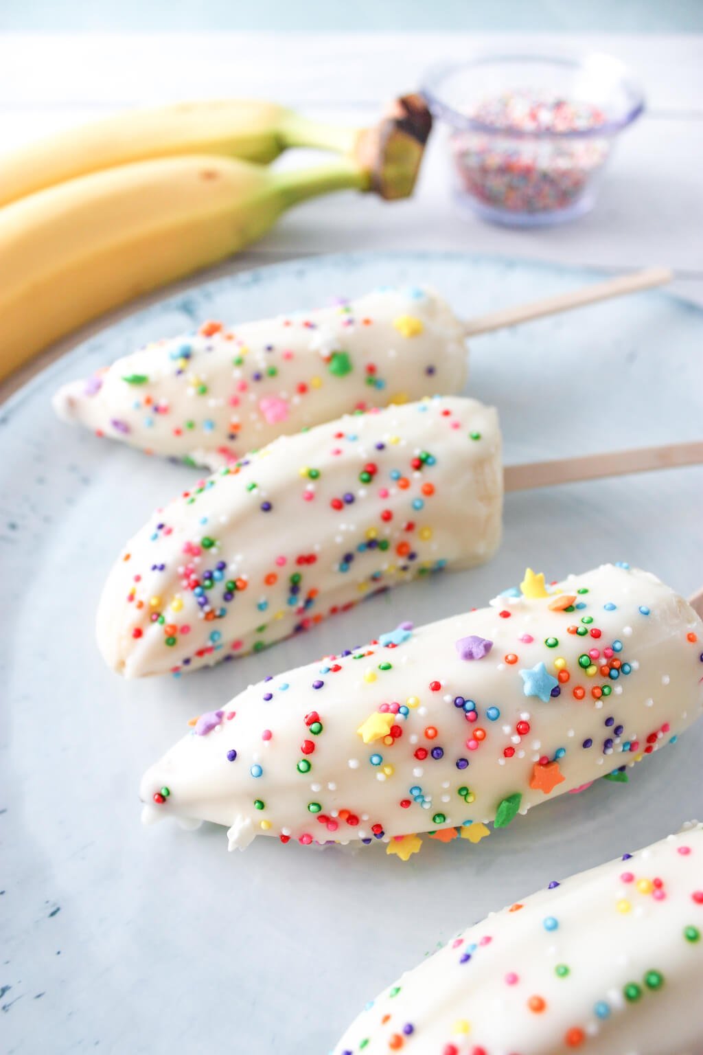 You can also change up the toppings. We went with sprinkles because we love the colorful crunch they add. But you may want to consider granola, mini chocolate chips, crushed nuts, or puffed rice cereal. These frozen banana pops would also be yummy drizzled with chocolate syrup or peanut butter.