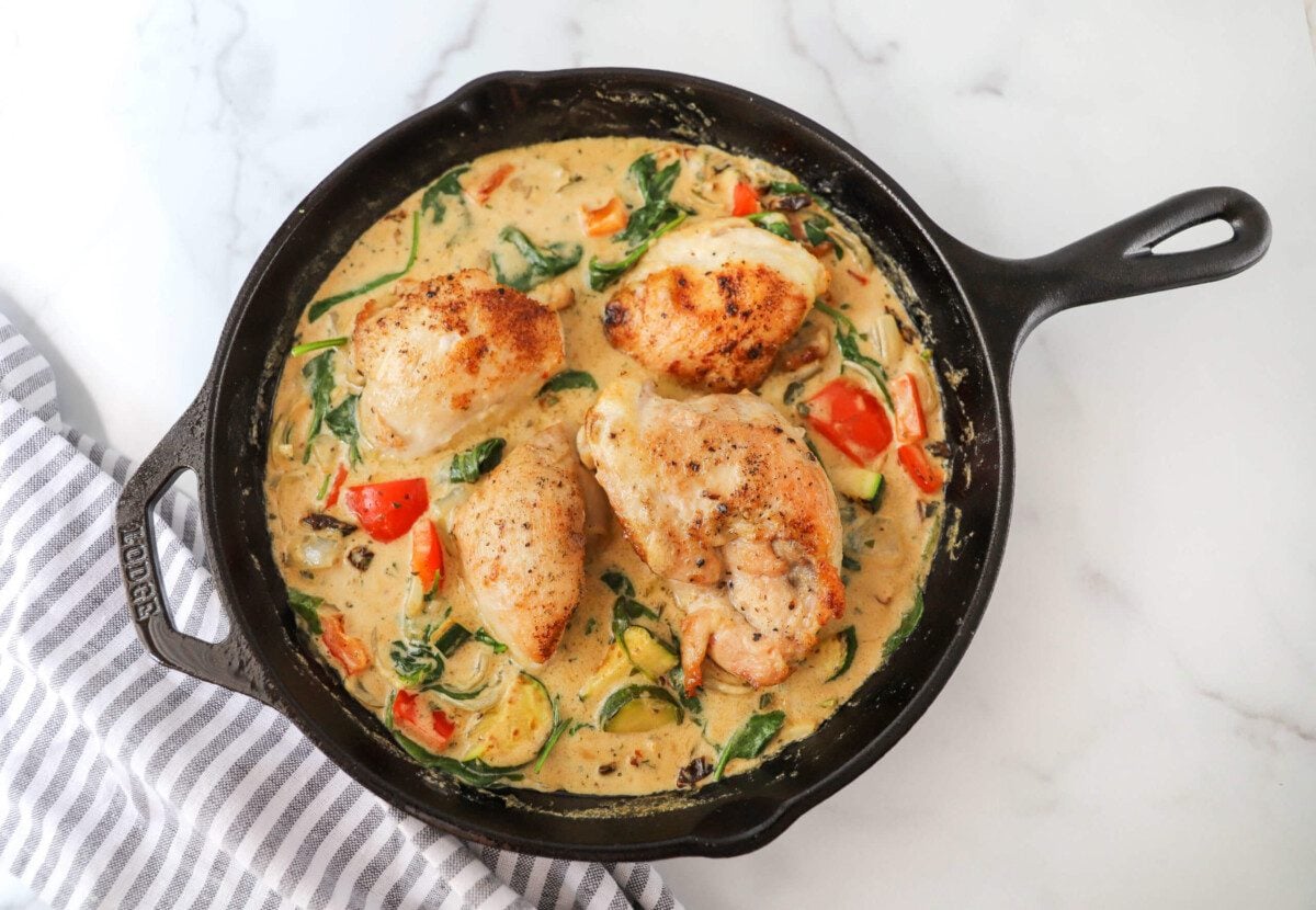 This tuscan chicken recipe incorporates some of our favorite “Tuscan” veggies including baby spinach, red bell pepper, onion, and zucchini. Combined with chicken thighs and a rich, creamy sauce, this is a recipe you’ll find yourself whipping up over and over again.