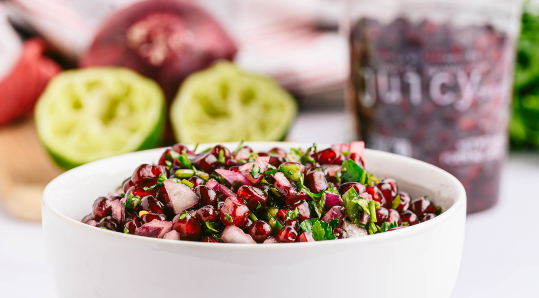 - In a large bowl, place the Juicy Gems Pomegranate Arils, red onion, cilantro and jalapeno.