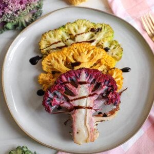 Plate your cauliflower steaks by layering one of each color on top of the other. Then, drizzle with a balsamic reduction.
