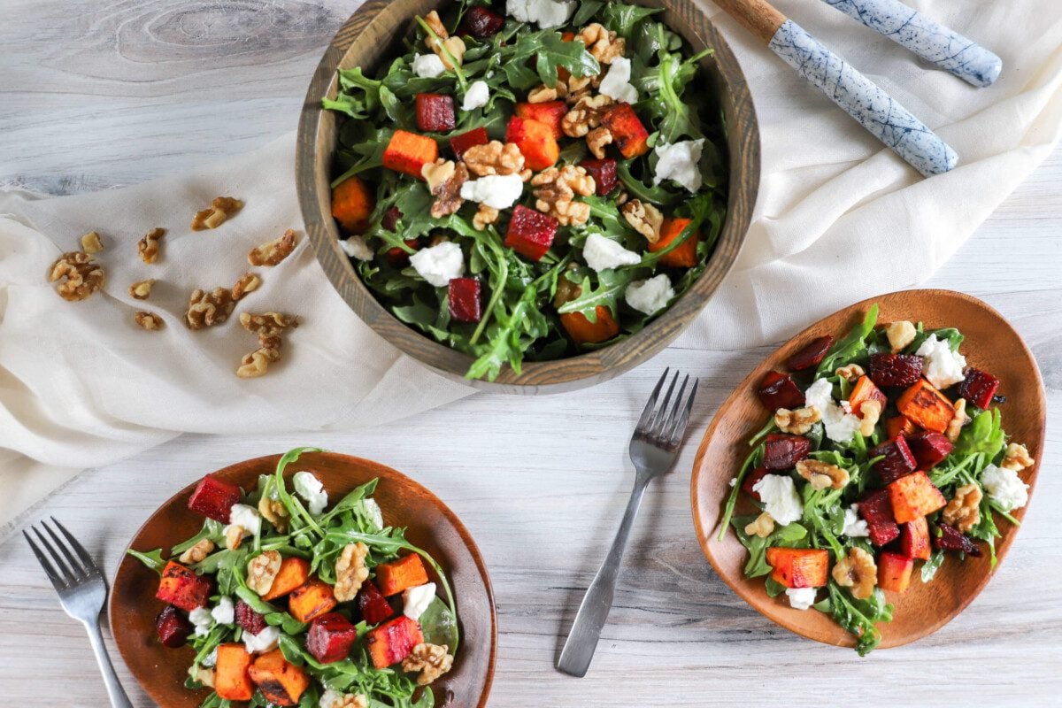 Roasted sweet potatoes and beets are a dynamic duo. Toss them together with arugula, walnuts, goat cheese, and a citrusy vinaigrette for a flavorful salad well-suited for a standalone lunch or as the perfect accompaniment to any meal.