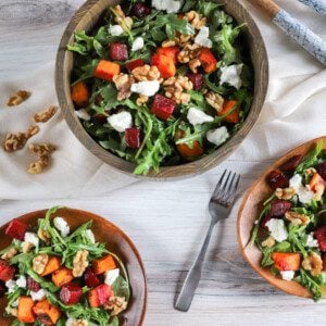 Now that your root veggies are cool, toss with the arugula, walnuts, goat cheese, and vinaigrette in a large salad bowl. Plate it up and prepare to fall in love. After trying this salad, we’re sure it will become a standard in your salad repertoire.