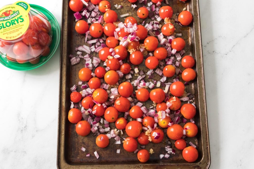 Step 2 – Prep the baking sheet. First, arrange NatureSweet Glorys® (whole or halved) on a shallow pan with onion chunks. Next, add 6 garlic cloves with skins still on. Then, drizzle with 1-2 tablespoons of olive oil over the pan and sprinkle generously with salt and freshly ground pepper. You can also add 4 sprigs of thyme over the top.