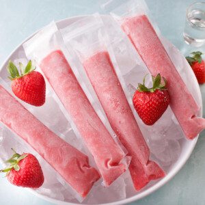 This poptail recipe couldn’t be any easier! It requires just 4 ingredients: strawberries, lime juice, rum, and agave nectar. Simply blend all the ingredients together in a blender and pour the mixture into ice pop bags, like these from Zipsicle. Pop them in the freezer and serve once they are frozen through.