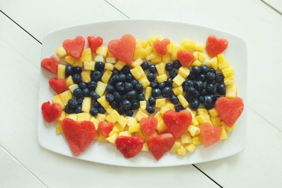- On a serving platter, arrange the blueberries so they spell "XOXO". Fill in around the blueberries with the pineapple chunks. Place the heart shaped watermelon pieces around the edge of the platter.